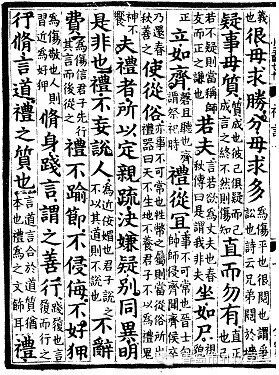 《礼记》中充满传诵千古的格言,琅琅上口,便于记诵和引用,这是《礼记》得以流传的重要原因之一。例如:“毋不敬,俨若思,安定辞,安民哉。”(《曲 礼》)“大学之道,在明德,在亲民,在止于至善。”(《大学》)“富润屋,德润身。”(《大学》)“好学近乎知,力行近乎仁,知耻近乎勇。”(《中庸》) “民以君为心,君以民为体。”(《缁衣》)“一张一弛,文武之道也。”(《杂记下》)“君子乐得其道,小人乐得其欲。”(《乐记》)在古代中国,《礼记》的格言家喻户晓,代代流传,成为人们立身、处事的准则。甚至不识字的民众,也能熟知《礼记》中的许多格言,这正是它的魅力之所在。